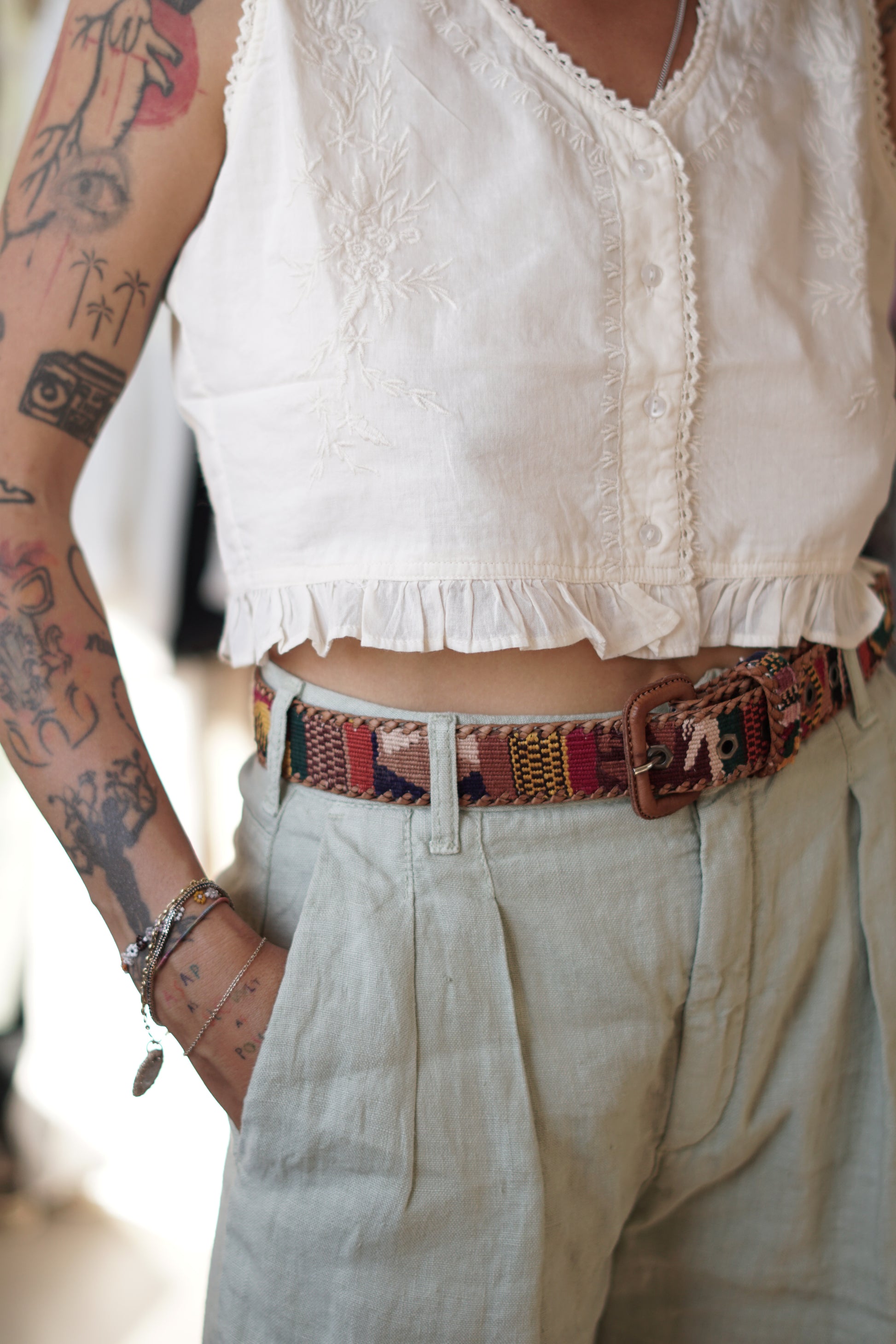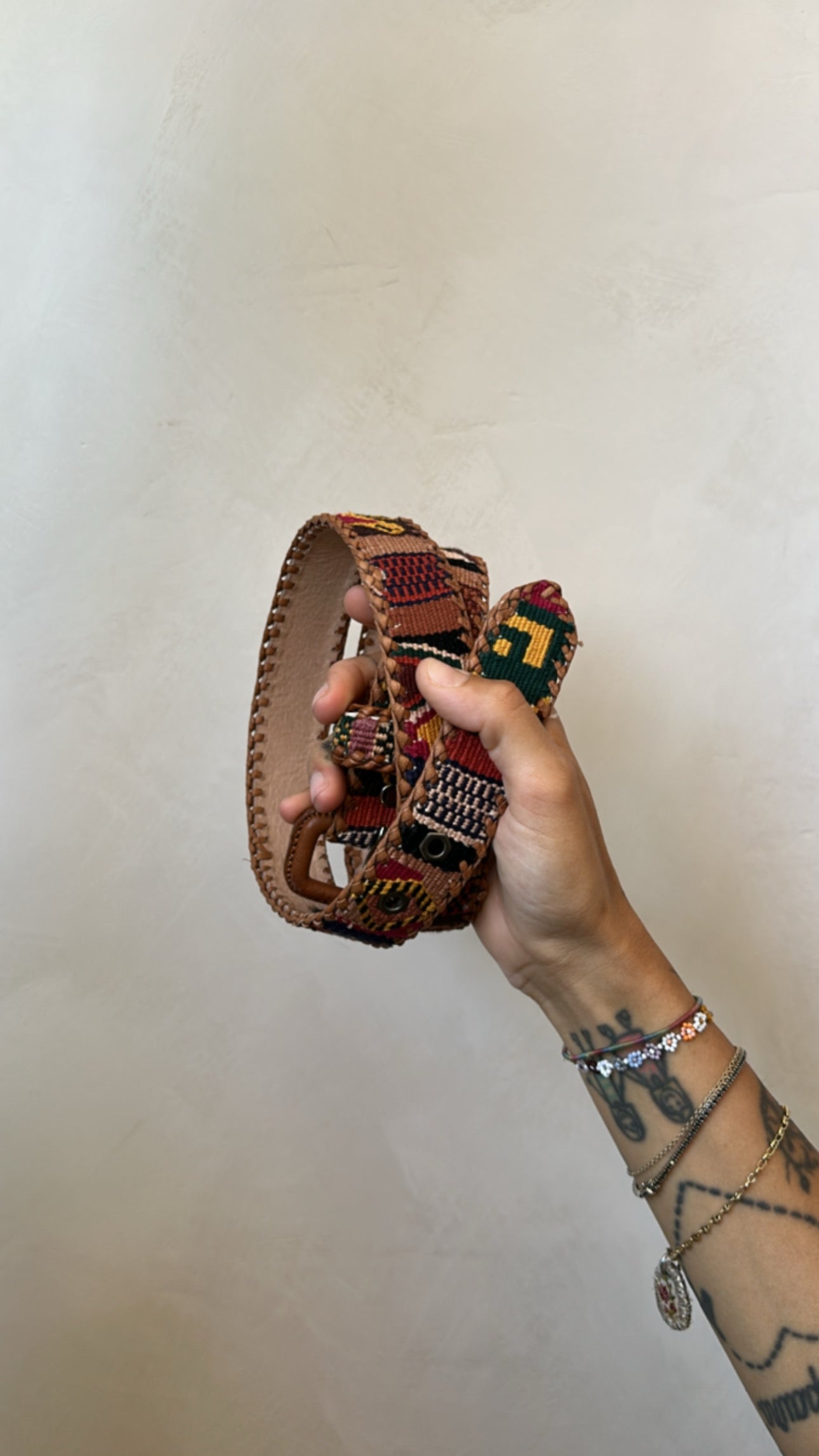 Cintura in pelle con decorazioni etniche in fili di cotone intrecciati a mano da artigiani di piccole comunità del Guatemala.