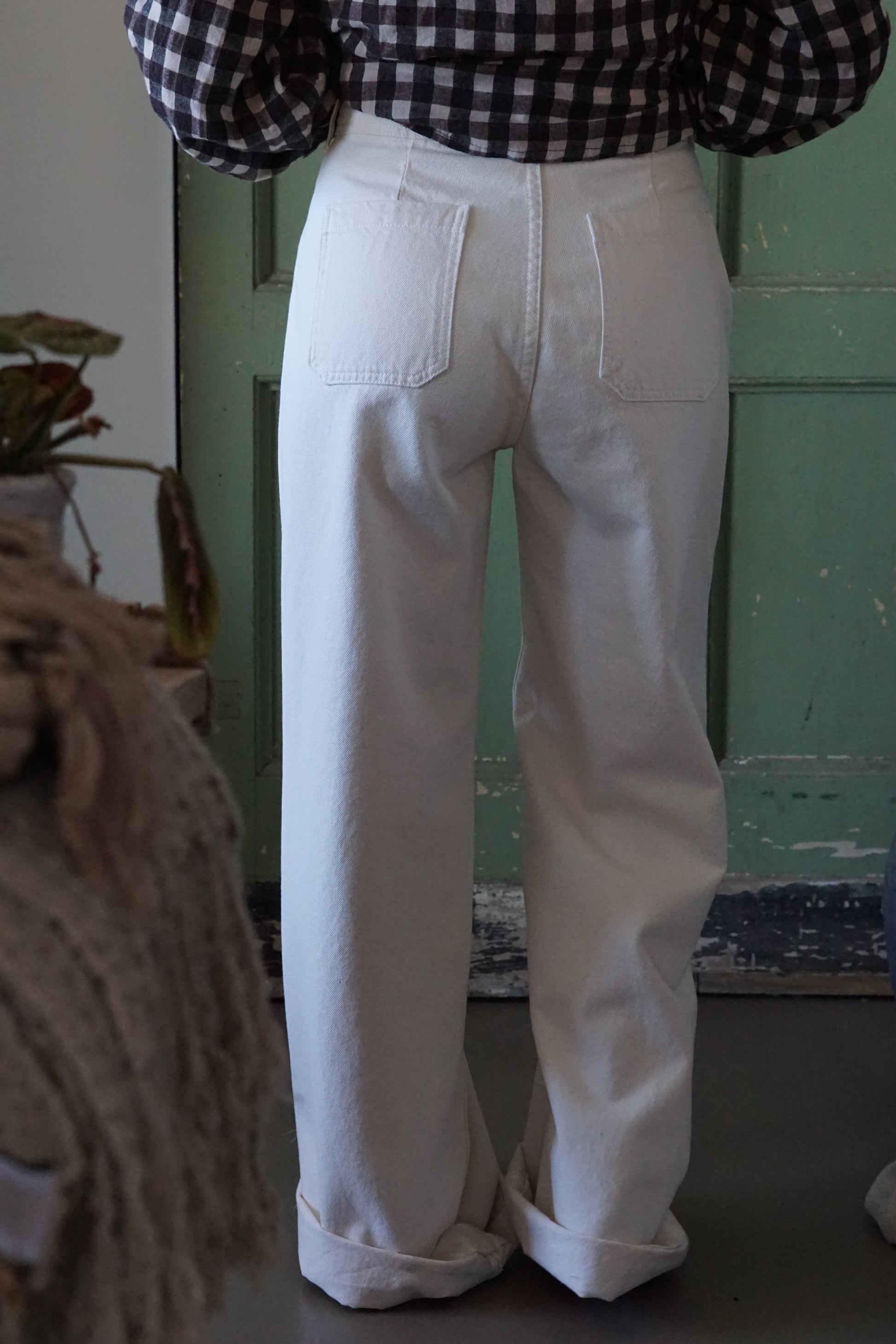 Denim ecru a vita alta, dotato di tasche frontali bordate con motivo a treccia.
