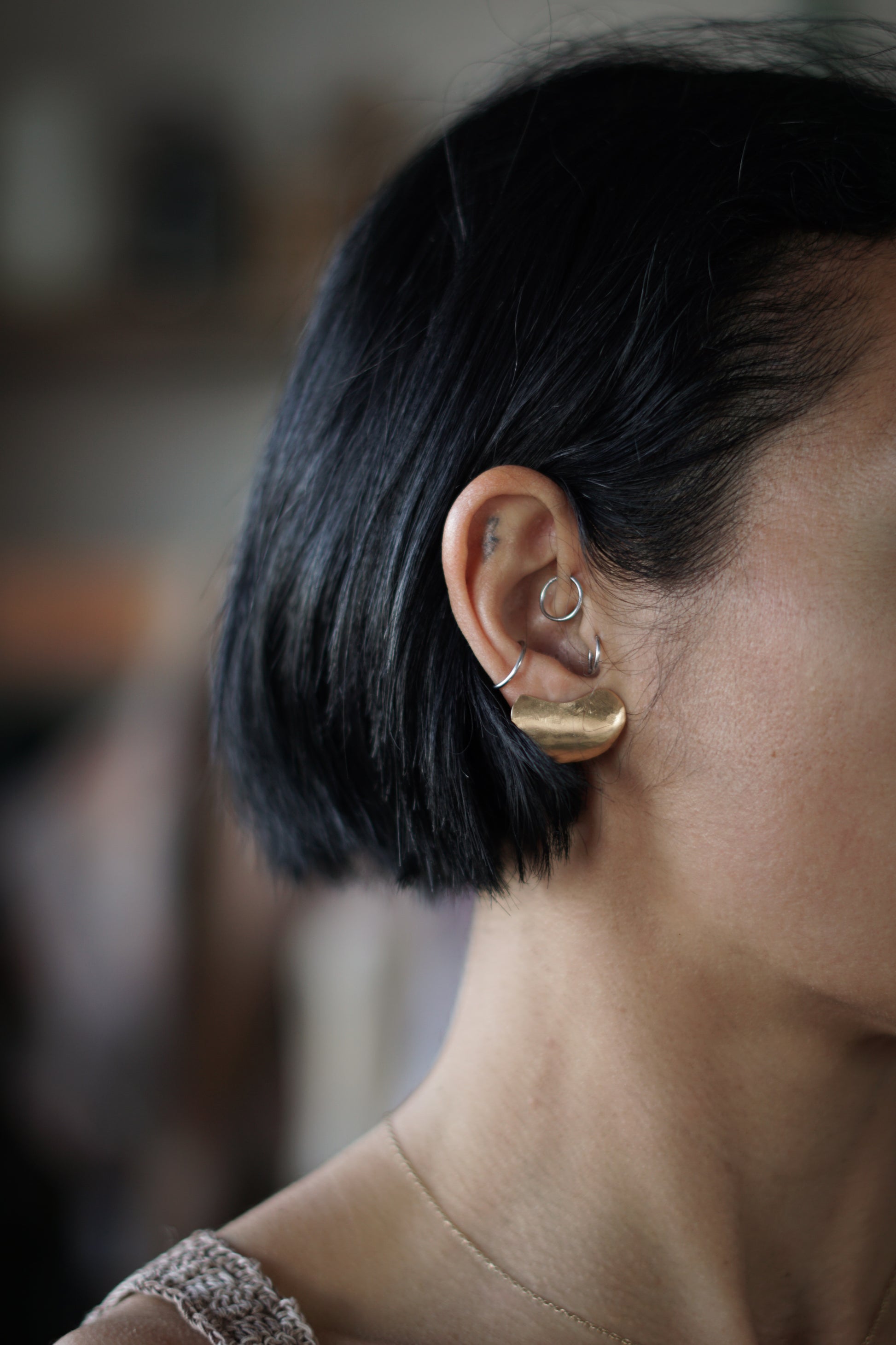 Mono* orecchino modellato richiamando la forma del lobo e realizzato con la tecnica della fusione a cera persa, in argento 925 / argento 925 placcato oro 24kt.